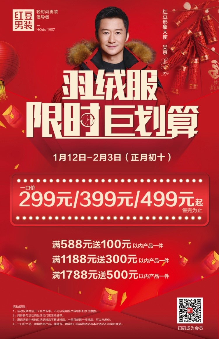 新年新裝,買紅豆男裝。1月12日-2月3日,紅豆男裝春節福利大放送,年貨節羽絨服限時巨劃算,新春爆款羽絨服299元起,更有線下滿送活動驚喜不斷。紅豆男裝狂歡啟動,與你共享鴻運新年!