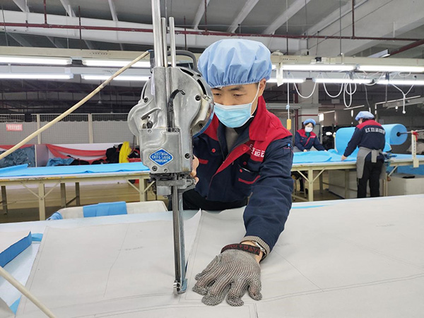 “沒有現成的提拉工具,就想其他辦法。先用鏟車把面料運到指定區域,為提高效率,我們用2個板凳自制了工具,順利將面料快速送上裁剪臺。”錢學民笑著說。