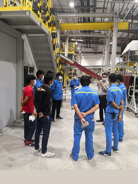 在國(guó)內(nèi)疫情嚴(yán)重的當(dāng)下,工廠內(nèi)沒有國(guó)內(nèi)的熟練工,朱崇留就對(duì)泰國(guó)員工進(jìn)行培訓(xùn),讓他們盡快成為能上前線的“戰(zhàn)士”。與此同時(shí),他并沒有忽視國(guó)內(nèi)半鋼工廠的工作任務(wù)。忙完泰國(guó)工廠的事后,又加班加點(diǎn)遠(yuǎn)程處理國(guó)內(nèi)車間的工作,壓延的問題點(diǎn)分析,設(shè)備的安裝調(diào)試,內(nèi)襯層壓延機(jī)調(diào)試等,事無(wú)巨細(xì),親力親為,用實(shí)際行動(dòng)發(fā)揮著共產(chǎn)黨員的模范帶頭作用。