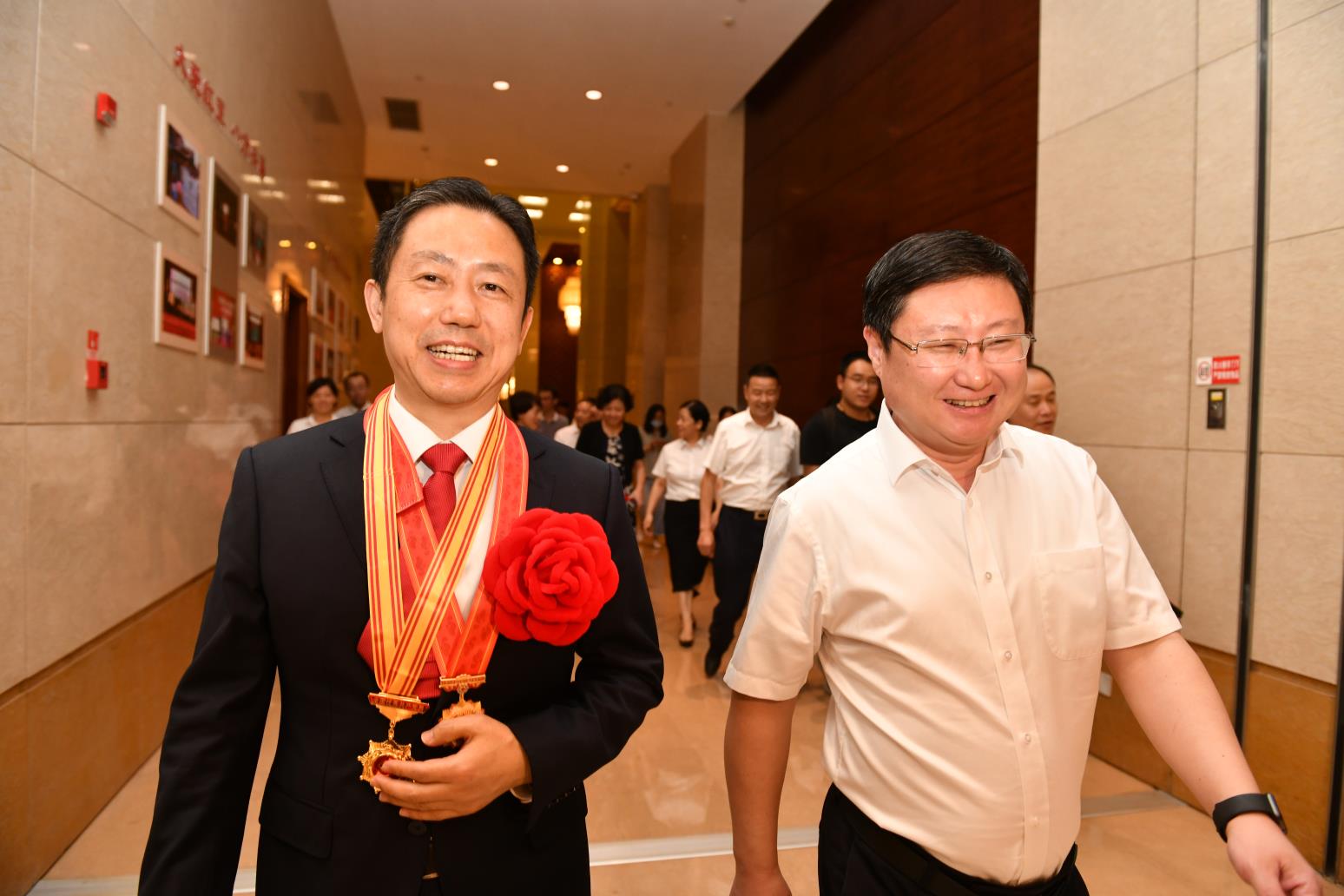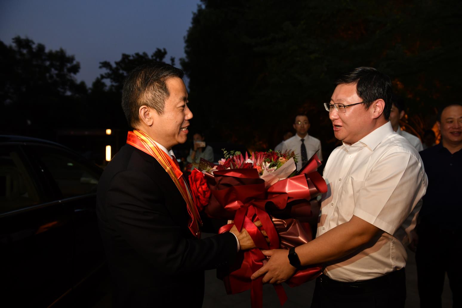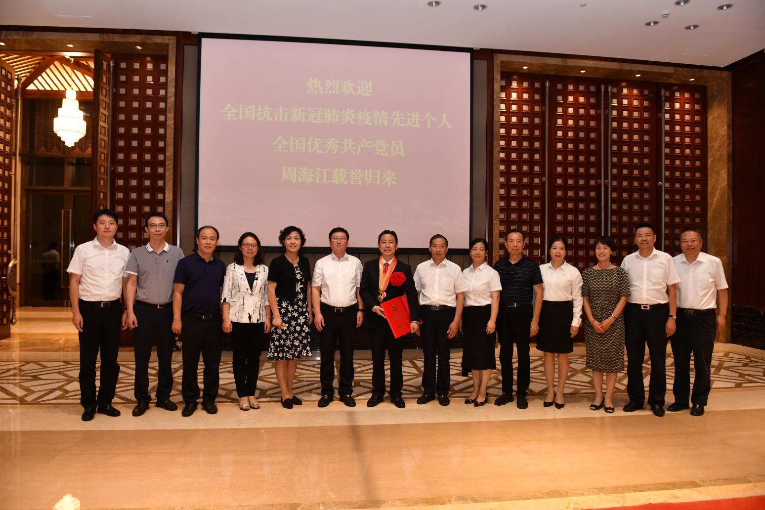 9月8日傍晚,受無錫市委黃欽書記委托,錫山區(qū)委書記周文棟、組織部部長竇虹、副區(qū)長陳奕一行代表市區(qū)黨政班子前往紅豆杉莊舉行簡單而隆重的儀式,熱烈歡迎剛剛獲“全國優(yōu)秀共產黨員”“全國抗擊新冠肺炎疫情先進個人”的紅豆集團黨委書記周海江從北京載譽歸來。
