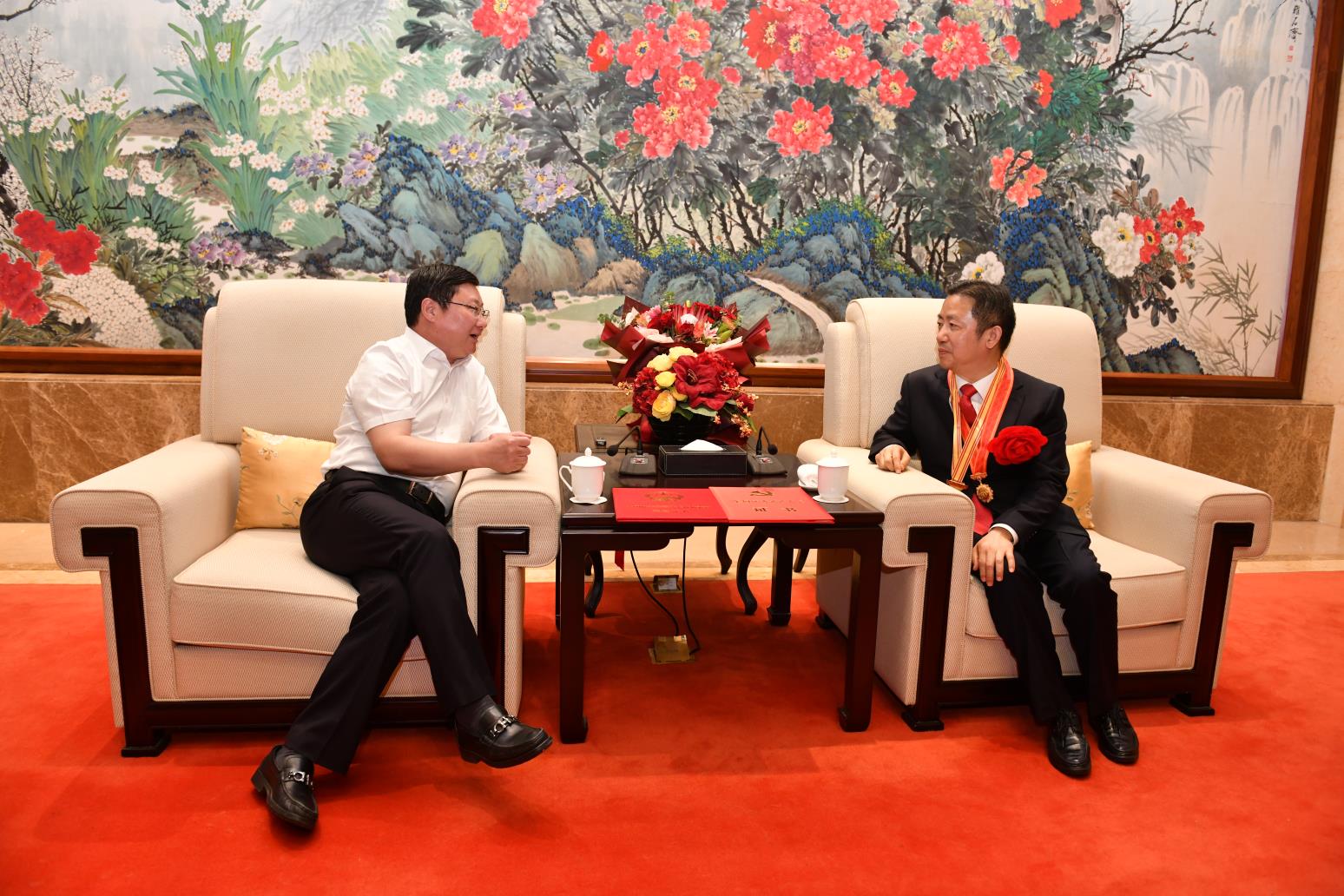 一見面,周文棟就高興地說,我代表錫山區(qū)四套班子,還有70萬錫山的老百姓歡迎周海江凱旋歸來。周海江獲得的兩項殊榮,不僅是個人的榮譽,紅豆的榮譽,還是我們整個錫山,還有無錫人民的巨大榮譽,是我們錫山區(qū)、無錫市的驕傲。可以說,周海江和紅豆集團獲得了黨建工作榮譽(全國先進基層黨組織、全國優(yōu)秀黨務工作者、全國優(yōu)秀共產黨員)的大滿貫。周海江十分感謝市區(qū)黨政班子的關心和支持。他說,此次全國抗擊新冠肺炎疫情表彰大會的儀式感很強,正如我們在視頻中所看到的鐘南山院士由國賓護衛(wèi)隊護衛(wèi)前往人民大會堂這是歷史第一次,勛章是由禮儀兵護送上去。我覺得黨中央是想通過此次活動把我們民族精神賦予新的內涵,即增加了抗疫精神,把抗疫的強大精神力量轉化為我們戰(zhàn)勝中美貿易戰(zhàn)等各種挑戰(zhàn)的力量源泉。周海江還表示,要化這種受激勵的奮進力量為推動紅豆轉型發(fā)展的動力。要努力把紅豆的工作做好,把企業(yè)經營好,加快進化升級,不負黨委、政府和人民的期望。周文棟表示,感同身受周海江參會氛圍的感染和偉大抗疫精神的力量傳遞,希望這種奮進的力量也能成為我們錫山“做全市重要增長極,當改革創(chuàng)新先行軍”的動力源!
