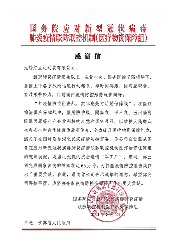 這是3月24日,紅豆集團下屬的紅豆運動裝公司收到國務院應對新型冠狀病毒肺炎疫情聯防聯控機制醫療物資保障組的感謝信中的一段話。